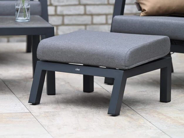 Dieser Loungehocker bietet eine komfortable Beinablage und kann darüber hinaus auch als zusätzlicher Sitzplatz genutzt werden. Er ist bis zu 120 kg belastbar und inklusive einer komfortablen, hochwertigen Polsterauflage mit einer formstabilen Füllung und einem Bezug aus besonders pflegeleichtem Strukturpolyester. Der wetterfeste Aluminiumrahmen ist anthrazitfarben pulverbeschichtet und dank seines angenehmen Gewichts einfach in der Handhabung.