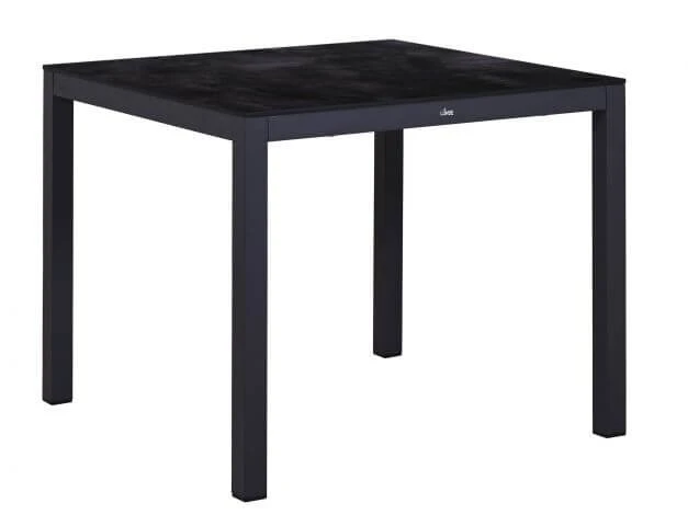 Das geradlinige Aluminium-Tischgestell aus quadratischen Vierkantprofilen verleiht dem Tisch ein klassisch zeitloses Design. Die Tischplatte ist aus Sicherheitsglas gefertigt und hat eine widerstandsfähige, unempfindliche Keramikschicht.