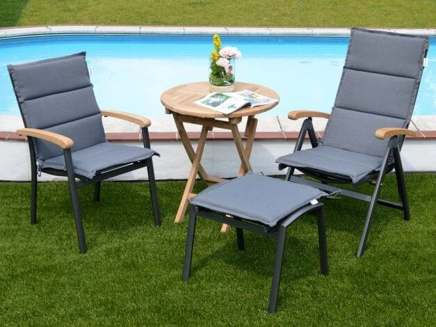 Der Bezug aus edlem Strukturpolyester hat eine angenehme Oberfläche und ist pflegeleicht. Für guten Halt in jedem Gartenstuhl befinden sich im Lehnenknick zwei Schnürbänder zum befestigen, sowie ein verstellbares Halteband an der Rückseite. Der umlaufende Stehsaum rundet das wertige Gesamtbild dieser Polsterauflage ab.