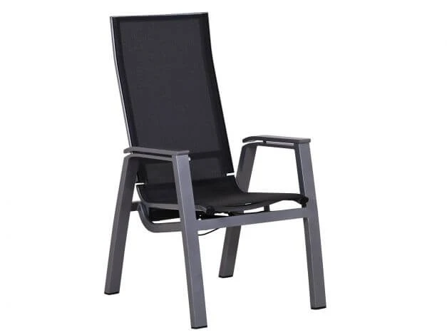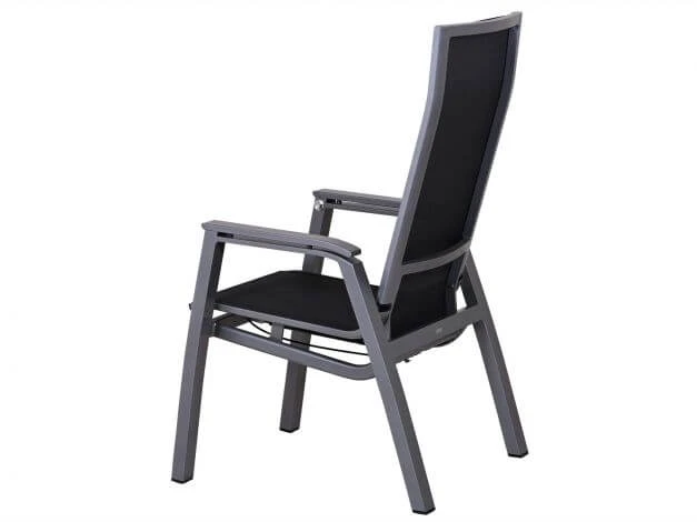 Das formschöne Aluminium-Gestell ist in der Farbe graphit pulverbeschichtet und ebenso pflegeleicht und wetterbeständig wie die angenehme und luftdurchlässige Outdoorgewebe-Bespannung von Sitz- und Rückenfläche. Übrigens: um dieses Gartenmöbel platzsparend zu verstauen können mehrere dieser Stühle übereinander gestapelt werden.