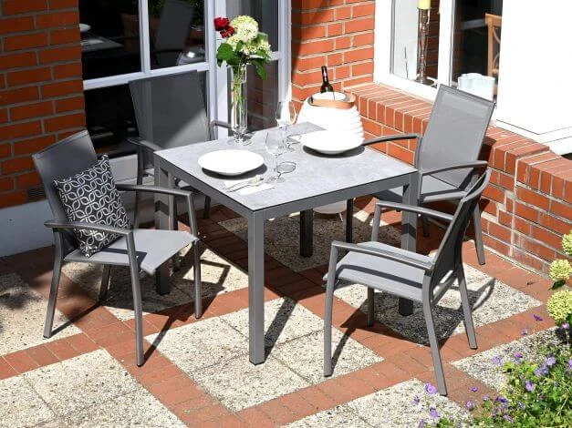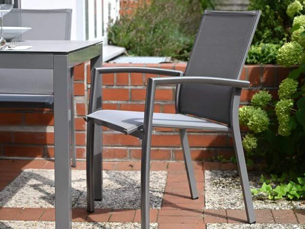 Langlebig und stabil wird der Stapelstuhl dank der verarbeiteten Materialien: Sowohl Rahmen aus pulverbeschichtetem Aluminium als auch die komfortable Outdoorgewebe-Bespannung sind wetterfest und pflegeleicht. Freuen Sie sich auf den Sommer und heißen Sie Ihre Gäste jederzeit willkommen.