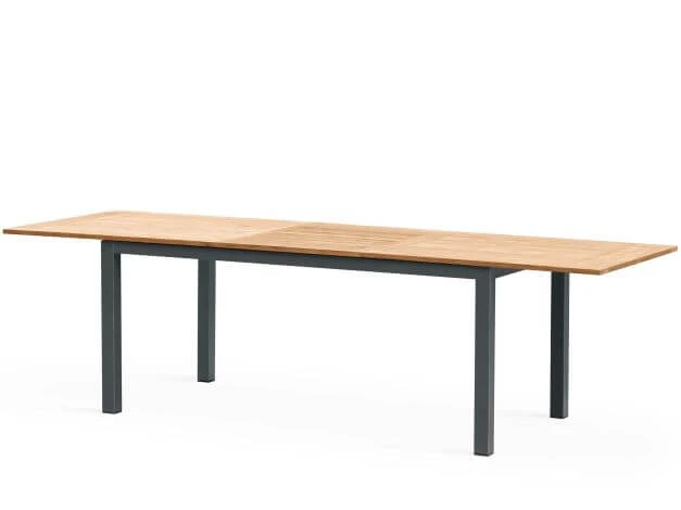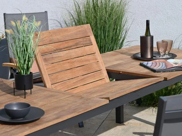Ein weiteres Highlight ist der elegante Mix zweier hochwertiger Materialien: der Rahmen und die Beine sind aus pflegeleichtem, pulverbeschichtetem Aluminium, die Belattung der Tischplatte aus dem Edelholz Teak. Das verarbeitete Teakholz überzeugt dabei mit einer stets angenehm temperierten und geschmeidigen Oberfläche und ist besonders langlebig und witterungsbeständig.