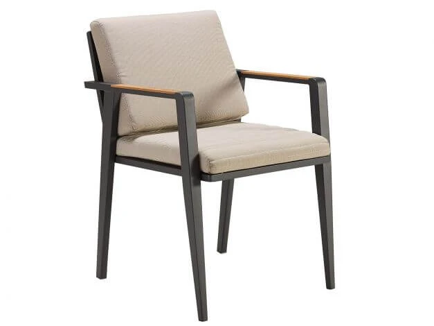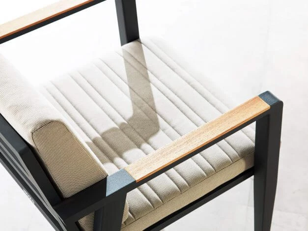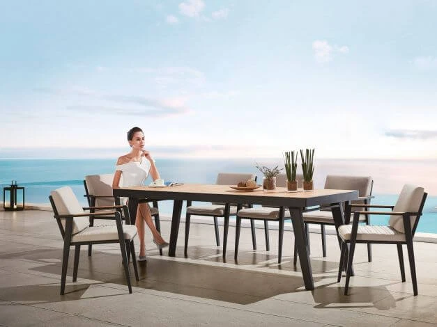 Regency bietet mit seiner eleganten Linienführung mit schrägstehenden Beinen eine moderne und edle Optik. Der wetterfeste Aluminiumrahmen ist anthrazitfarben pulverbeschichtet und hat für eine stets wohl temperierte Armablage in den Armlehnen Einlagen aus hochwertigem Teakholz.