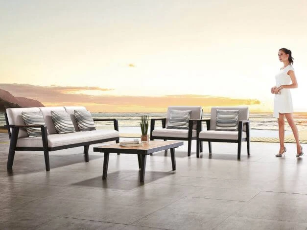 Der wetterfeste Aluminiumrahmen ist anthrazitfarben pulverbeschichtet und dank seines angenehmen Gewichts einfach in der Handhabung. Einlagen aus hochwertigem Teakholz in den Armlehnn runden zudem das elegante Gesamtbild dieses Loungemöbels ab.