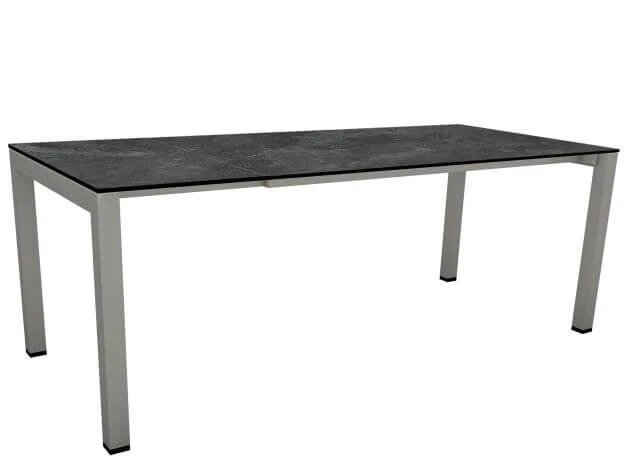 Die hochwertige Tischplatte besteht aus bis zu 50, unter Hochdruck gepresster Lagen Laminatschichten (HPL) und ist dadurch ideal für den Außenbereich. Silverstar ist ein Plattendesign mit einer einzigartigen Haptik. Es bietet zudem eine hohe Kratzfestigkeit, ist kälte- (-20°C) und hitzebeständig (180°C), UV-beständig sowie besonders pflegeleicht und abriebfest. Der seitlich sichtbare Kern ist schwarz und die Oberfläche hat ein modernes Dekor.