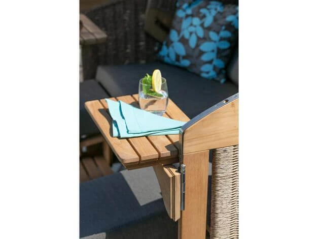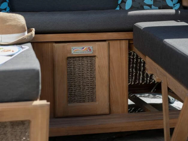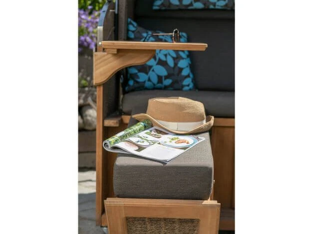 Der Strandkorb Madura ist zudem aus Teakholz gearbeitet. Die Kissenausstattung ist perfekt auf den Korb abgestimmt. Auch hier sind die bequemen Nacken- und Knuffelkissen dick gepolstert und bestechen durch das moderne Blätterdesign. Weitere Extras sind das aufwendig geflochtene Geflecht an den Seitenteilen, die Panoramafenster in Halbmond-Design im Oberkorb sowie zwei Cocktailtische. Die ausziehbaren Fußstützen machen Ihr entspanntes Feeling perfekt. Diese sind ebenfalls dick gepolstert, bequem und auch in der Höhe verstellbar.