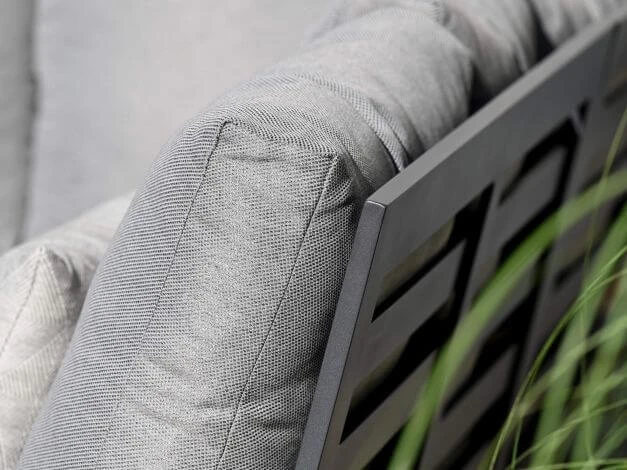 Die wetterfesten Rahmen aus stabilem Aluminium haben ein modernes Design und haben auf den Armlehnen elegante Einsätze aus hochwertigem Teakholz. Jeder Sitzplatz ist bis zu 130 kg belastbar und inklusive komfortabler, besonders hochwertiger Sitz- und Rückenpolster mit einer formstabilen Füllung und einem Bezug aus spinndüsengefärbtem Garn mit besonders hoher Lichtechtheit.