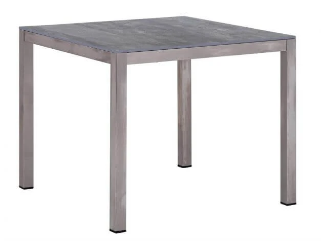 Das geradlinige Tischgestell aus hochwertigen, quadratischen Edelstahl Vierkantprofilen verleiht dem Tisch ein klassisch zeitloses Design. Die Tischplatte ist aus Sicherheitsglas gefertigt und hat eine widerstandsfähige, unempfindliche Keramikschicht.
