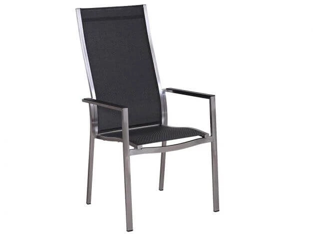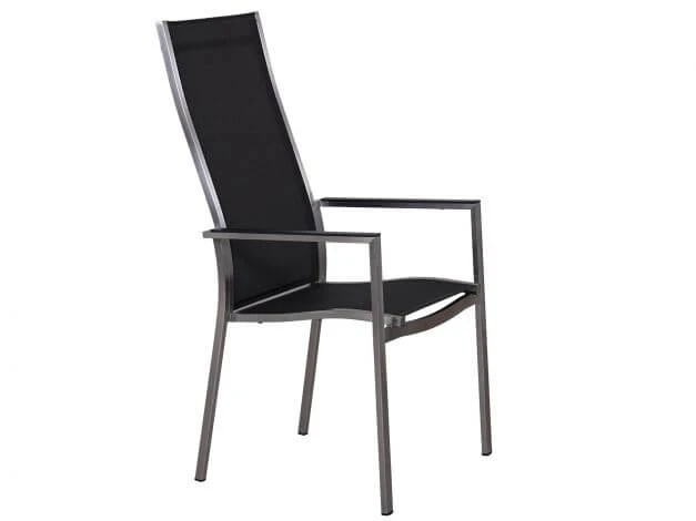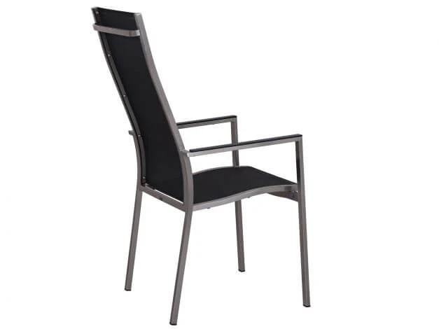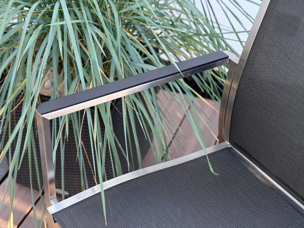 Ob für modern eingerichtete Terrasse oder klassischen Garten – dieser Edelstahl Gartenstuhl fügt sich mit seinem zeitlosen, filigranen Design perfekt in jedes Gartenambiente ein. Durch die extra hohe Rückenlehne mit ergonomischen Schwung bietet der Palladium Highback zudem ganz besonderen Sitzkomfort. Farblich passend zu der Bespannung sind die anthrazitfarbenen Armlehnen aus Aluminium.