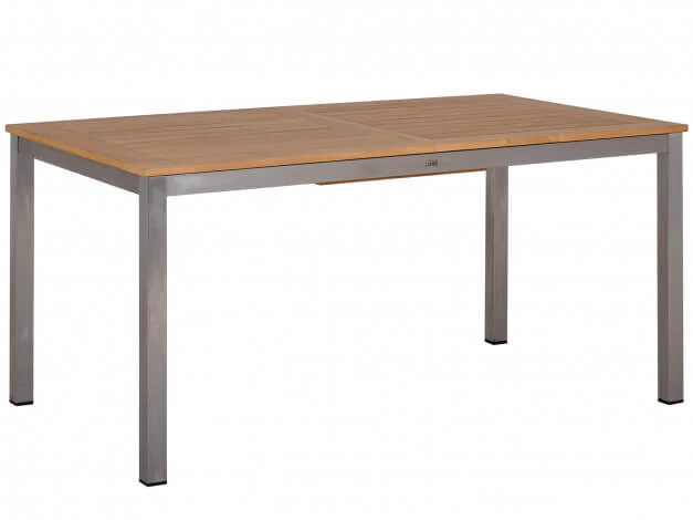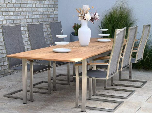 Ein weiteres Highlight ist der elegante Mix zweier hochwertiger Materialien: der Rahmen und die Beine sind aus pflegeleichtem Edelstahl, die Belattung der Tischplatte aus dem Edelholz Teak. Das verarbeitete Teakholz überzeugt dabei mit einer stets angenehm temperierten und geschmeidigen Oberfläche und ist besonders langlebig und witterungsbeständig.