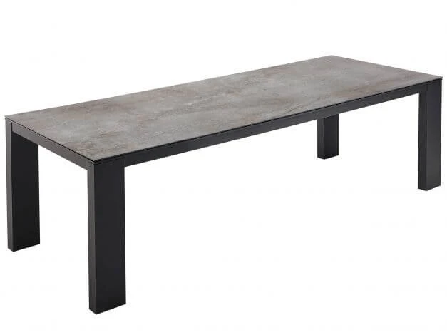 Das Tischgestell aus Aluminium trägt eine Dektonplatte. Dekton ist ein revolutionäres Material bei dessen Herstellung eine Vielzahl an Mineralien unter extremen Druck verpresst werden. Durch diesen hochtechnologischen Prozess entsteht ein Material welches die höchste Kratzunempfindlichkeit auf dem Markt bietet, höchst UV-beständig ist und sogar noch abriebfester als Granit ist. Dazu kommt maximale Frost- und Feuerbeständigkeit. Daher ist das Material ideal für den Einsatz im Außenbereich geeignet. Eine Besonderheit ist zudem, dass im Gegensatz zu z.B. HPL die sichtbaren Kanten dem Plattendekor folgen.