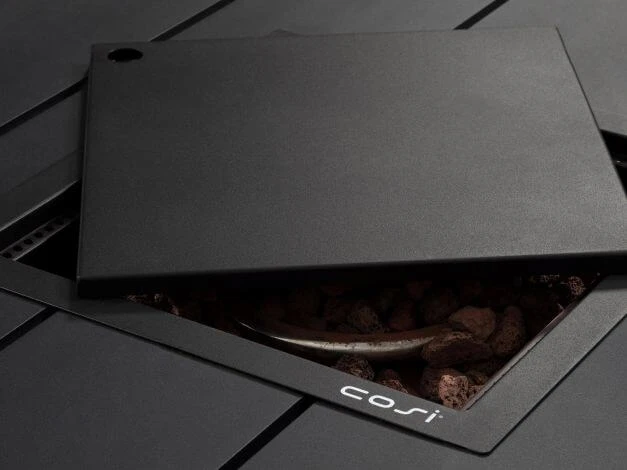 Unter der Tischplatte befindet sich eine zusätzliche Ablage, auf der nützliche Dinge verstaut werden können. Da sich eine Gasflasche (max. 40 cm hoch, separat erhältlich) im inneren unterbringen lässt, lässt sich der Standort von Cosiflow zudem jederzeit ändern. Die Feuerstelle wird mit einem 30 mBar Regler mit Gasschlauch, 4 Keramikscheiten, Lavasteinen und einer Abdeckplatte für die Feuerstelle geliefert.