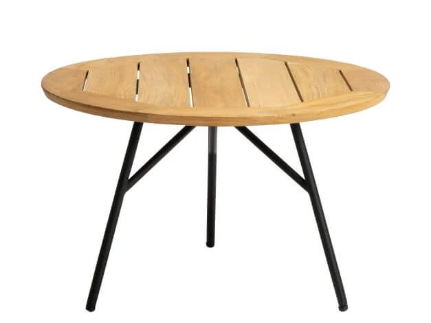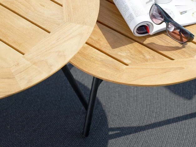 Frida von Stern hat ein modernes Dreibein-Untergestell aus schwarz matt pulverbeschichtetem Aluminium, das mit einer hochwertigen Tischplatte aus Teak Holz kombiniert wird. Die Plattenkante ist elegant abgeschrägt (schweizer Kante) und da Frida in zwei Größen mit unterschiedlichen Höhen erhältlich ist, können zum Beispiel zwei Frida Beistelltische optisch ansprechend einander überlappend aufgestellt werden.