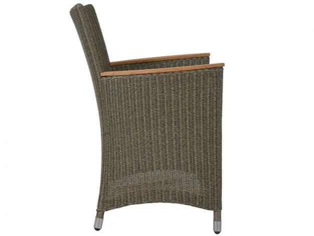 Die Basis bei diesem Polyrattan Gartensessel ist ein stabiles und dennoch leichtes Aluminiumgestell, welches mit witterungsbeständigem Kunststoffgeflecht umflochten ist. Kunststoffgeflecht ist ein speziell für den Garten entwickeltes, pflegeleichtes Geflecht. Ein optisches Highlight sind die beiden Armlehnen aus Teakholz, die darüber hinaus mit ihrer geschmeidigen und stets wohl temperierten Oberfläche eine angenehme Armablage bieten.
