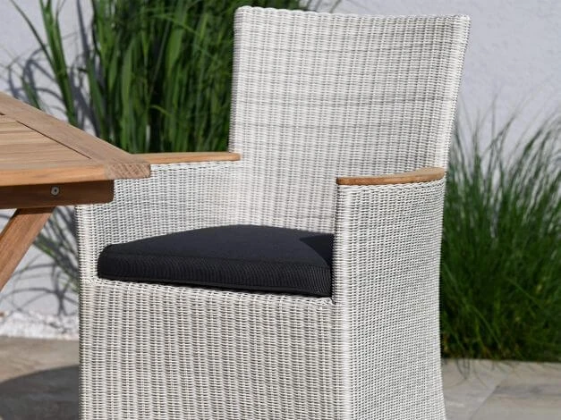 Gartensessel aus Polyrattan mit hochwertigen Teakholz-Armlehnen und passendem Sitzkissen