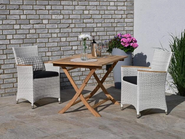 Die Basis bei diesem Polyrattan Gartensessel ist ein stabiles und dennoch leichtes Aluminiumgestell, welches mit witterungsbeständigem Kunststoffgeflecht umflochten ist. Kunststoffgeflecht ist ein speziell für den Garten entwickeltes, pflegeleichtes Geflecht. Ein optisches Highlight sind die beiden Armlehnen aus Teakholz, die darüber hinaus mit ihrer geschmeidigen und stets wohl temperierten Oberfläche eine angenehme Armablage bieten.
