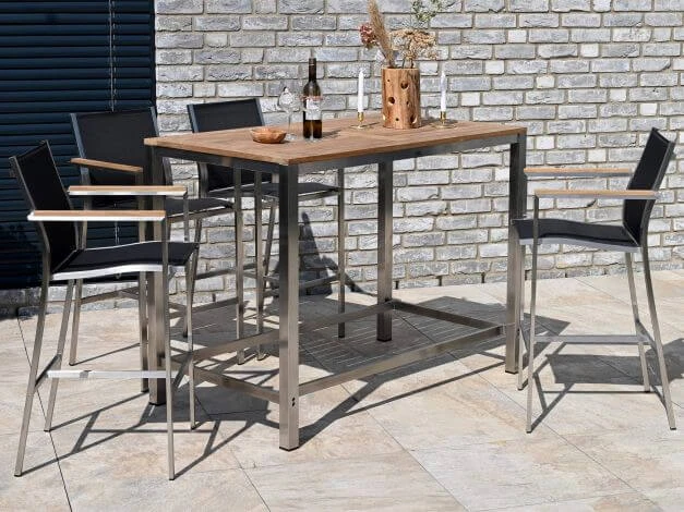 Der robuste Edelstahlrahmen des Bartisches ist zudem äußerst langlebig und bietet dank der Streben im unteren Bereich eine bequeme Fußablage. Laden Sie Freunde und Familie zu sich nach Hause ein und feiern Sie gemeinsam mit ihnen im Garten an unserem Edelstahl Bartisch Barolo.