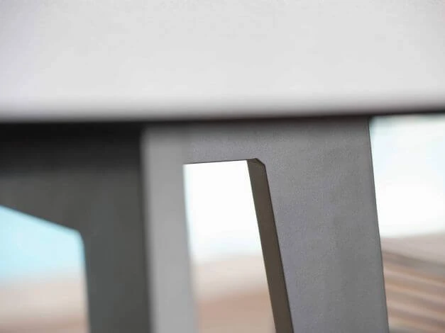 Die hochwertige Tischplatte mit abgeschrägter (schweizer) Kante besteht aus bis zu 50, unter Hochdruck gepresster Lagen Laminatschichten (HPL), und ist genauso wie das Gestell aus pulverbeschichtetem Aluminium perfekt für den Einsatz imFreien geeignet.