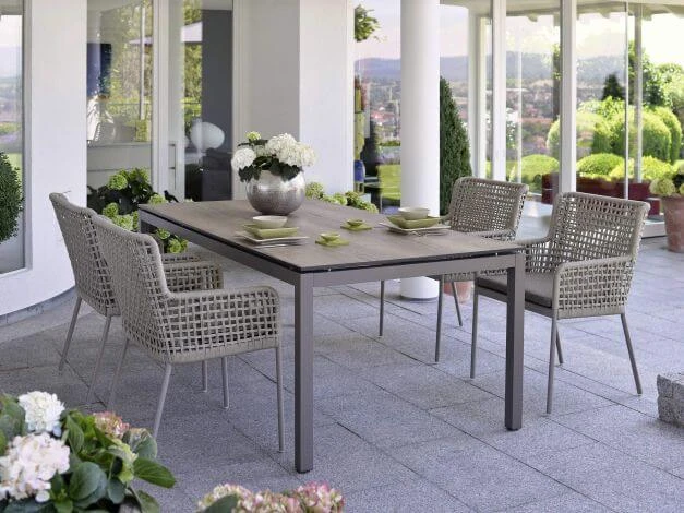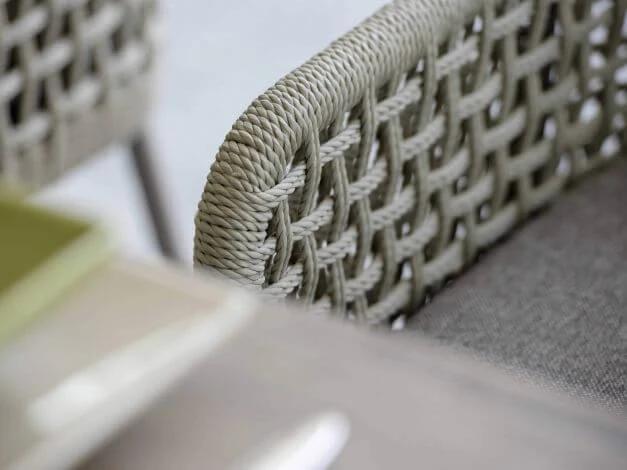 Die bequemen Gartenmöbel der Serie Greta überzeugen mit einer durchgefärbten Polypropylen-Faser und einer Sitzfläche aus Textilen – so kann die beliebte Serie im Indoor-Look bedenkenlos im Außenbereich eingesetzt werden. Die offene Flechtung in Kordeloptik ist zudem unverwechselbar und passt perfekt zu der Formensprache von Greta.