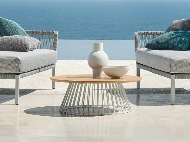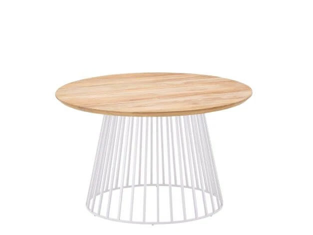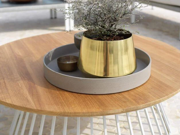 Grid ist eine Kollektion runder Lounge- und Beistelltische in trendigem Industrial Design. Das filigrane, transparent gitterartige Untergestell besteht aus pulverbeschichtetem Aluminium und wird mit einer hochwertigen, geschlossenen Teakholz-Tischplatte kombiniert.