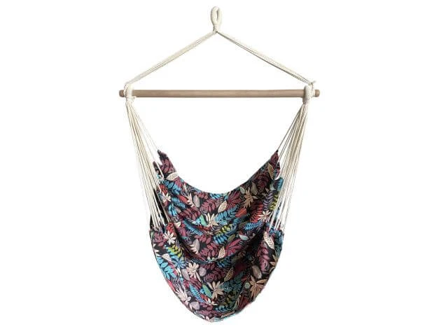 Der farbenfrohe Hängesessel Deluxe von Lesli Living bietet ideale Voraussetzungen für erholsame Momente auf Ihrem Balkon oder der Terrasse. Dieser Sessel wird aus einem Gemisch von Baumwolle und Polyester gefertigt und hat ein farbenfrohes Printmotiv. Befestigt ist der Sitz mit in Handarbeit geflochtenen, extra dicken Schnüren an einer Holzstange. Die maximale Belastungskapazität des Sessels beträgt 100 kg.