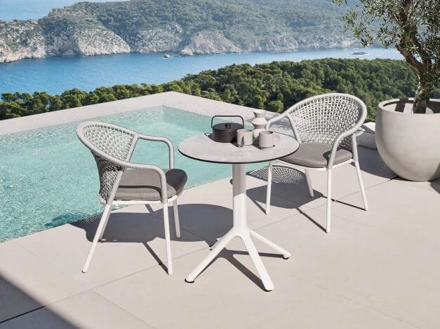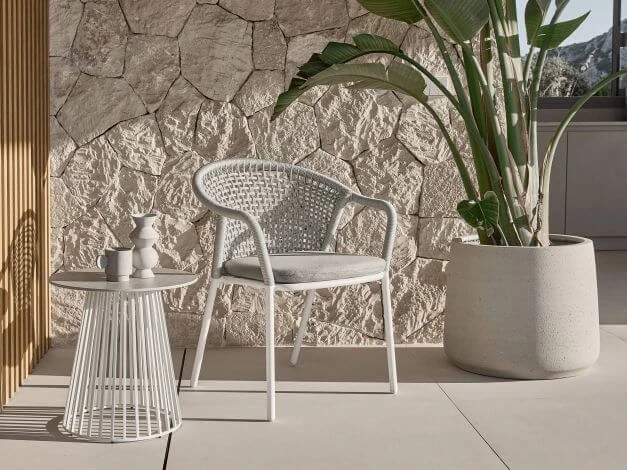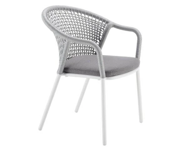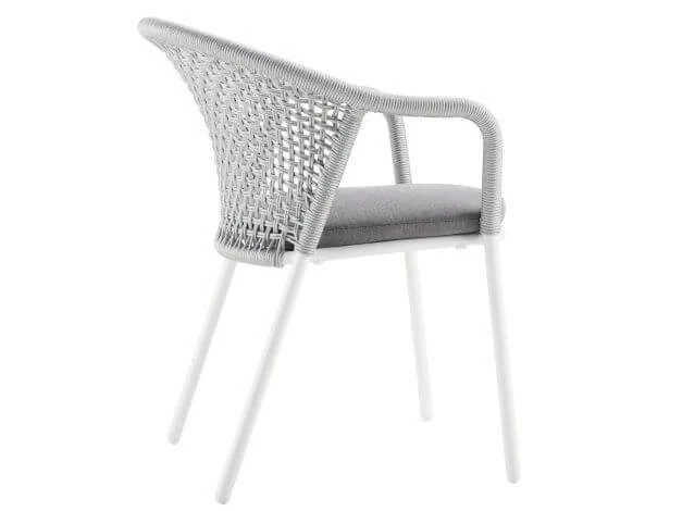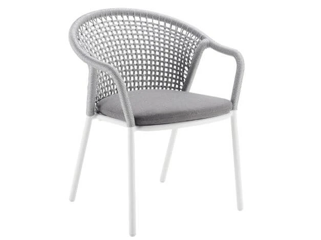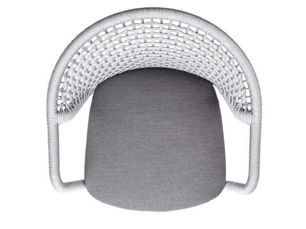 Der Gartensessel Jooy zeichnet sich durch seine weich fließende, abgerundete Formgebung aus. Die Armlehnen und die komfortable Rückenschale sind mit einem modernen Seilgeflecht umflochten. Der Stuhl wurde im Jahr 2023 vom Solpuri Design Studio entworfen und kommt inklusive eines komfortablen Sitzpolsters in der Farbe anthracite.