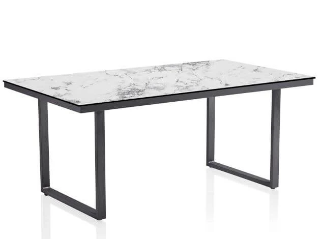Die Tischplatte ist aus widerstandsfähigem HPL (HPL = unter Hochdruck gepresstes Mehrschichtlaminat), welches besonders frost- und hitzebeständig (-20°C bis +180°C), wetterfest, pflegeleicht und unempfindlich ist. Für eine freundliche Optik hat hat die Platte ein ansprechendes Marmordekor in weiß.