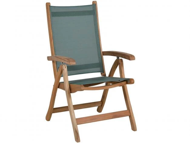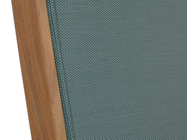 Dieser Teakstuhl bietet einen einmaligen Materialmix: Sitz- & Rücken sind mit einem moosfarbenem Outdoorgewebe bespannt. Dadurch bietet dieser Hochlehner nicht nur enorm hohen Sitzkomfort sondern ist auch leichter als ein Vollholzstuhl.