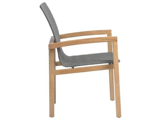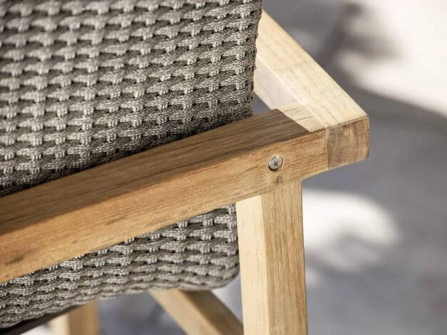 Der Sessel Leah aus Holz vereint eine besondere Formensprache mit dem beliebten Material Teak. Die Sitzschale ist mit einer hochwertigen Synthetikfaser in der Farbe steingrau bespannt, bietet ein angenehmes Sitzgefühl und verleiht dem klassischen Look ein stilvolles, modernes Element.