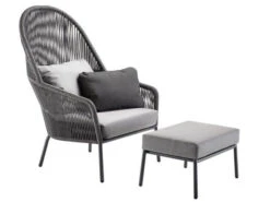 Bei diesem super gemütlichen Set erhalten Sie einen Loungesessel mit extra hoher Lehne und dem passenden Hocker für eine herrlich entspannende Fußablage. Beide Sitzpolster sind outdoorfähig mit einem Bezug in der Ausführung Bombay anthracite wetterfest. Der hohe Sessel hat zudem ein Rückenpolster Bombay anthracite und ein Cocktail-Kissen im Kontrastfarbton Bombay graphite.