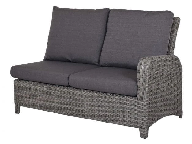 Mit diesem 2-Sitzer Modul mit Armlehne auf der rechten Seite kann (in Verbindung mit weiteren, separat erhältlichen Modulen) eine elegante Eck-Lounge, eine Recamiere oder ein lockeres Lounge-Ensemble gestaltet werden. Für hohen Sitzkomfort sorgen bei diesem Modul die komfortablen Polster. Das halbrunde Polyrattan-Geflecht ist auf hochwertigen Aluminiumrahmen geflochten und in verschiedenen grau- und steintönen koloriert.