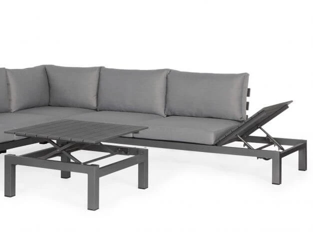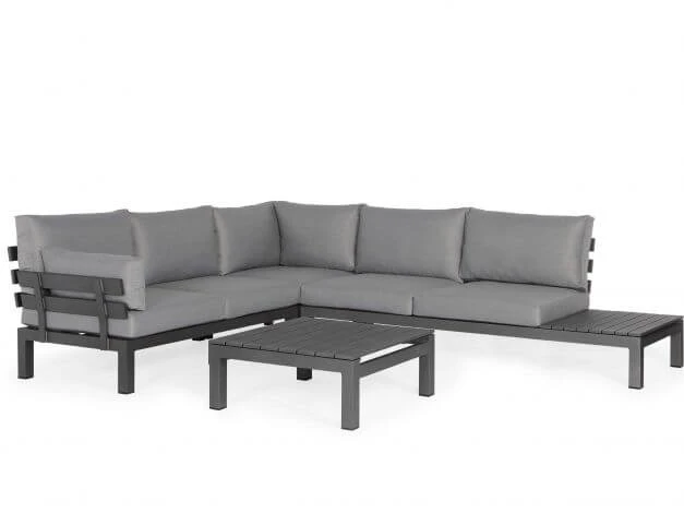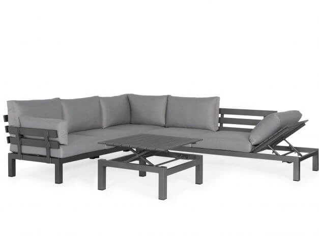 Dieses Loungeset kommt in einem modernen, puristischen Look und bietet nicht nur dank der komfortablen Kissenausstattung mit einer besonders stabilen Füllung höchsten Komfort. Auf Wunsch verwandelt sich das linke Modul in eine gemütliche Entspannungsliege – die seitliche Ablage lässt sich dafür ganz einfach mehrfach verstellen und bildet in Kombination mit einem Rückenkissen eine Kopfstütze wie bei einer Gartenliege.