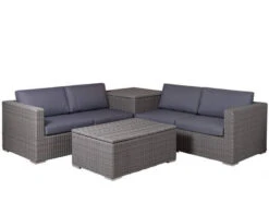 Diese Ecklounge bietet eine gemütliche Sitzgelegenheit in jedem Garten. Besonders raffiniert sind die Aufbewahrungstruhen die sich sowohl im Couchtisch als auch im Ecktisch befinden. So können Sie die bequemen Polster – die bereits im Lieferumfang mit enthalten sind – direkt in der Sitzgruppe aufbewahren.