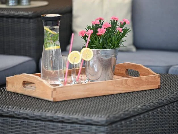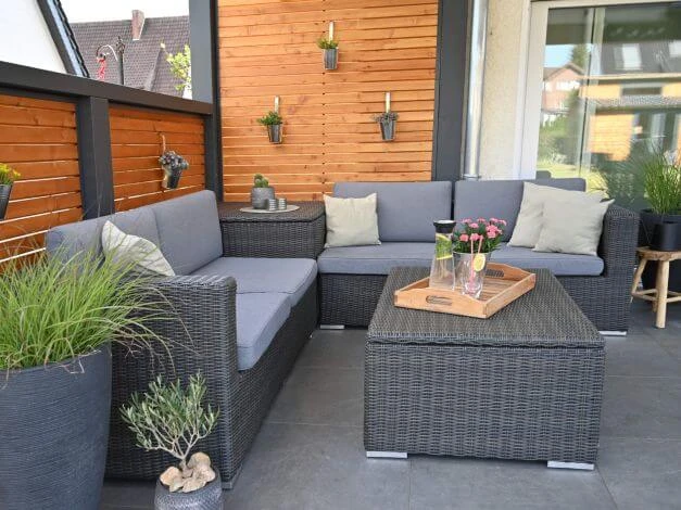 Diese Ecklounge bietet eine gemütliche Sitzgelegenheit in jedem Garten. Besonders raffiniert sind die Aufbewahrungstruhen die sich sowohl im Couchtisch als auch im Ecktisch befinden. So können Sie die bequemen Polster – die bereits im Lieferumfang mit enthalten sind – direkt in der Sitzgruppe aufbewahren.