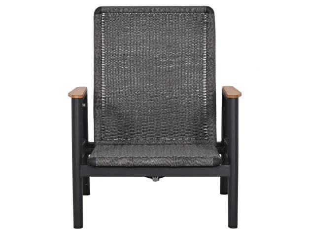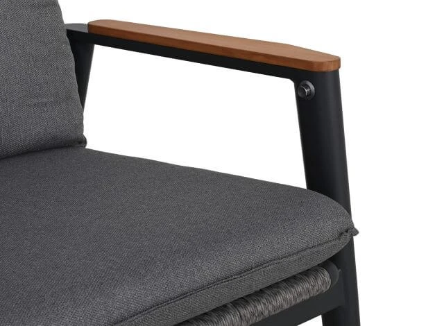 Der visuelle Reiz der Loungemöbel Fairfield liegt in den eleganten Rahmen mit angenehm geformten Rundrohrprofilen. Die Sitzflächen und Rückenlehnen werden zudem aufwendig mit einer wetterfesten Ropefaser umflochten, was den Gartenmöbeln eine besonders individuelle und elegante Ausstrahlung verleiht. Die Teak-Armlehnen sorgen zudem für einen natürlichen Touch und ergänzen den Komfort mit ihrer angenehm geformten Oberfläche.