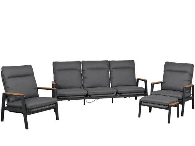 Dank des großen 3-Sitzer Sofas und den bequemen Sesseln nebst einem Hocker bietet dieses Gartenmöbel Set jede Menge Platz zum Entspannen im Freien. Um einen maximalen Sitzkomfort zu gewährleisten, sind farblich abgestimmte Polster im Lieferumfang enthalten. Alle Rückenlehnen lassen sich zudem kinderleicht und komfortabel stufenlos nach hinten neigen.