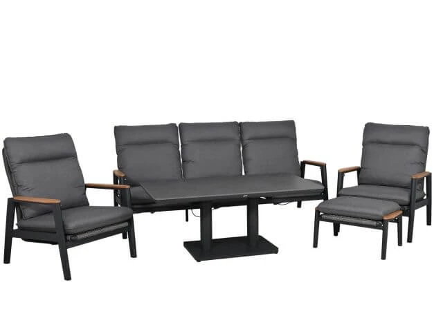 Dank des großen 3-Sitzer Sofas und den bequemen Sesseln bietet dieses Gartenmöbel Set jede Menge Platz zum Entspannen im Freien. Neben den stufenlos verstellbaren Lehnen der Sessel und der Sitzpläte des Sofas, ist ein weiteres Highlight dieser Gruppe der Tisch: Dieser lässt sich ganz einfach stufenlos in der Höhe verstellen. So können Sie nahtlos in Ihrem Freizeitprogramm vom Essen am Tisch in Dininghöhe zum entspannten Abendgetränk am niedrig eingestellten Couchtisch übergehen.