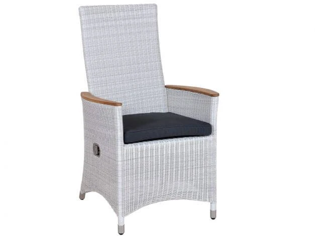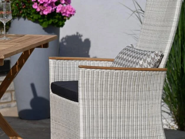 Sie wollen sich auch in Ihrem Geflechtsessel entspannt zurücklehnen können und die Sonne genießen? Kein Problem! Der pflegeleichte Move Positionssessel „Long Island“ ist einfach zu handhaben und lässt sich durch einen Hebel an der Seite problem- und stufenlos in eine gemütliche Liegeposition verstellen. Für eine angenehme und stets wohl temperierte Armablage sind zwei hochwertige Teakholz Armlehnen befestigt.