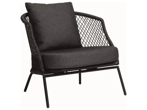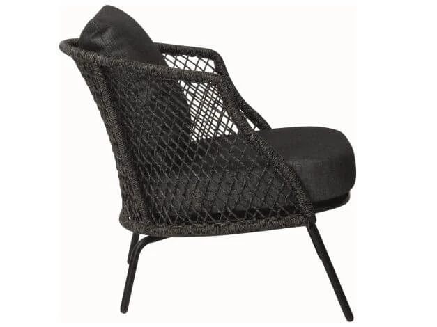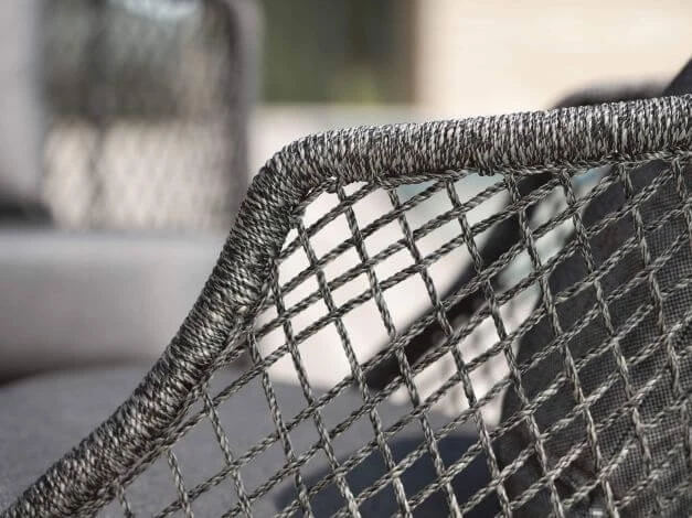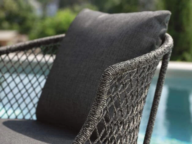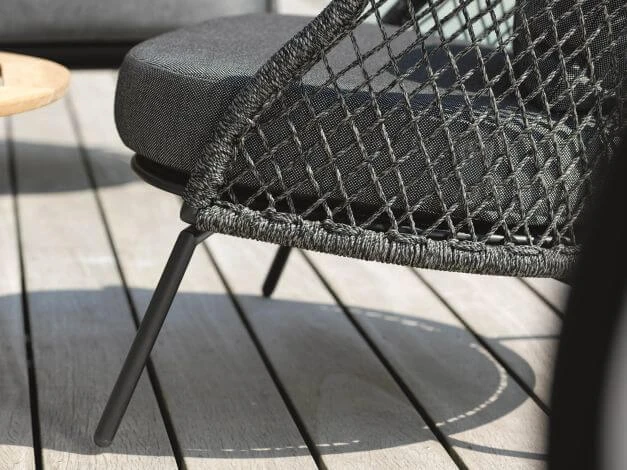 Die rautenförmige, offene Flechtung lässt die Formen der Serie Odea luftig und locker wirken. Das Rope aus Polypropylen ist besonders strapazierfähig und leicht. Die zweifarbige Melierung in der Kordel verleiht ihr ein natürliches Aussehen. In Kombination mit der farblich abgestimmten, wetterfesten Outdoor Polsterung mit einem seidenschwarzen Bezug aus 100% Polyacryl wirkt Odea zudem besonders stilvoll.
