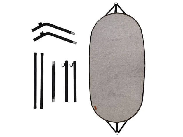 Auch wenn die Materialien für den dauerhaften Einsatz im Freien geeignet sind, empfehlen wir bei starkem Wind und Stürmen die Hängematte vom Rahmen zu nehmen und geschützt zu lagern.