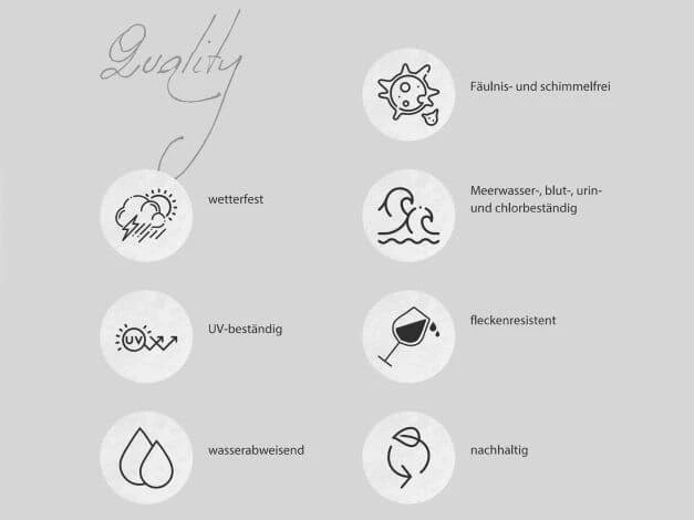 Der wasserabweisende Bezug aus sunproof® Outdoor-Gewebe ist bakterienresistent, Oeke-Tex Standard 100 zertifiziert, recycelbar und kann sehr leicht mit einem feuchten Tuch und etwas Seife gereinigt werden. Da die Outdoor-Zierkissen fäulnis- und schimmelfrei sind sowie die Füllung aus recyceltem Polyether besteht, sind sie besonders langlebig und nachhaltig.
