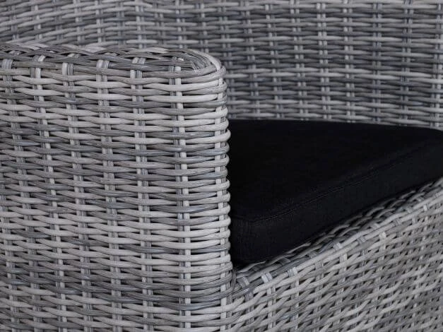 Das 7 mm Halbrundgeflecht kommt in einer ansprechenden Farbgebung aus weißgrauen Farbtönen. So wirkt dieser Sessel sehr modern und passt hervorragend in die meisten Gärten. Passend zu seiner Geflechtfarbe ist ein dunkelgraues Sitzkissen im Lieferumfang mit enthalten. Dank integriertem Reißverschluss kann bei dem Kissen der Bezug bei Bedarf abgezogen und jederzeit separat gewaschen werden.
