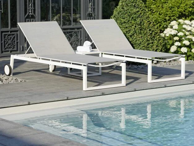 Der Alurahmen bei diesem modernen Gartenmöbel ist für einen minimalen Pflegeaufwand pulverbeschichtet und wird mit einem ebenso pflegeleichten, hautsympathischen und luftdurchlässigen Textilenbezug bespannt.