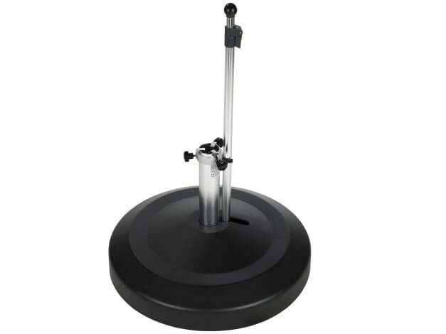 Mithilfe der ausziehbaren Teleskopstange lassen sich vier gummierten Rollen an der unterseite ein- & ausfahren. Gleichzeitig dient sie als Führungsstange um diesen Schirmständer in Arbeitshöhe bewegen zu können. Im Inneren befinden sich zudem vier Betonsegmente die im wesentlichen das Gewicht dieses Ständers ausmachen. Sie lassen sich einzeln herausnehmen, so dass Sie bei einem Standortwechsel Ihren Rollensockel besser transportieren können.