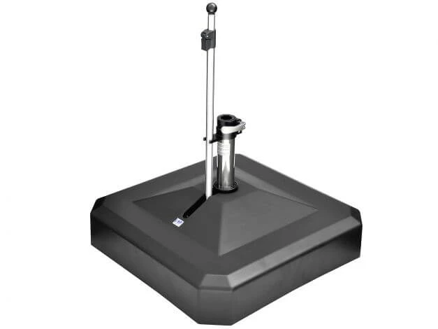 Die K-Line von LiRo hat eine komfortable Schnellspannung für die Arretierung eines Schirmstocks. Mithilfe der ausziehbaren Teleskopstange lassen sich vier gummierten Rollen an der unterseite ein- & ausfahren. Gleichzeitig dient sie als Führungsstange um diesen Schirmständer in Arbeitshöhe bewegen zu können. Im Inneren befinden sich zudem vier Betonsegmente die im wesentlichen das Gewicht dieses Ständers ausmachen. Sie lassen sich einzeln herausnehmen, so dass Sie bei einem Standortwechsel Ihren Rollensockel besser transportieren können.