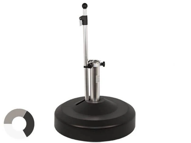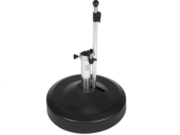 Mithilfe der ausziehbaren Teleskopstange lassen sich vier gummierten Rollen an der unterseite ein- & ausfahren. Gleichzeitig dient sie als Führungsstange um diesen Schirmständer in Arbeitshöhe bewegen zu können. Im Inneren befinden sich zudem vier Betonsegmente die im wesentlichen das Gewicht dieses Ständers ausmachen. Sie lassen sich einzeln herausnehmen, so dass Sie bei einem Standortwechsel Ihren Rollensockel besser transportieren können.
