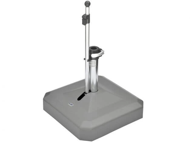 Die K-Line von LiRo hat eine komfortable Schnellspannung für die Arretierung eines Schirmstocks. Mithilfe der ausziehbaren Teleskopstange lassen sich vier gummierten Rollen an der unterseite ein- & ausfahren. Gleichzeitig dient sie als Führungsstange um diesen Schirmständer in Arbeitshöhe bewegen zu können. Im Inneren befinden sich zudem vier Betonsegmente die im wesentlichen das Gewicht dieses Ständers ausmachen. Sie lassen sich einzeln herausnehmen, so dass Sie bei einem Standortwechsel Ihren Rollensockel besser transportieren können.