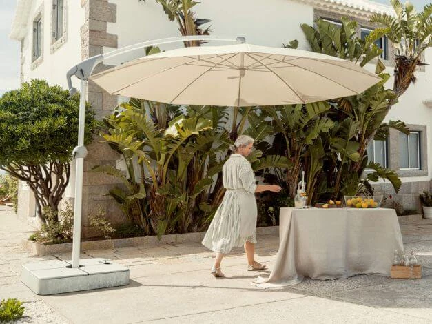 Dieser fahrbare Schirmständer erlaubt das Bewegen eines großen Sonnenschirms rückenschonend und auch im aufgespannten Zustand – so können Sie Ihren Schattenspender bequem und einfach an den gewünschten Ort fahren. Über das Trittpedal lässt sich der Sockelrahmen fixieren oder über eine clevere Mechanik die Laufrollen freigeben, um den Sonnenschirmständer bewegen zu können (glatter, ebener Boden vorausgesetzt).