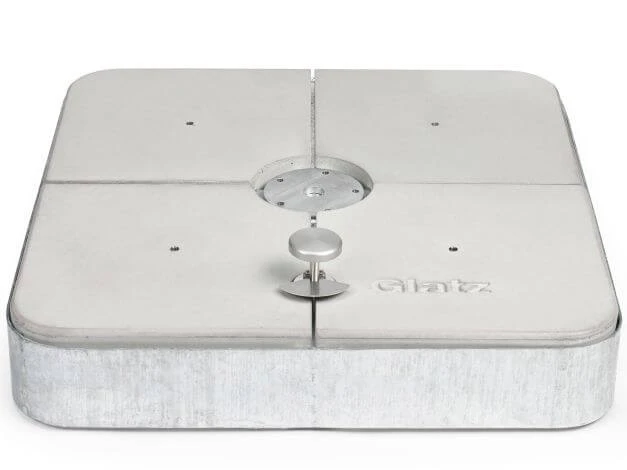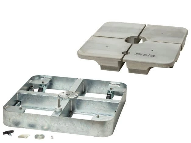 Mittig befindet sich eine 5-Loch Aufnahme (M4) auf die z.B. der Ampelschirm Sombrano® S+ oder ein Standrohr M4 für diverse Glatzschirme montiert werden können. Um das schwere, 4-teilige Gewichte-Set bessern handhaben zu können, haben die Gewichtssegmente ein integriertes Gewinde, so dass mit dem dazu passenden Schlüssel die Gewichte einzeln entnommen werden können.