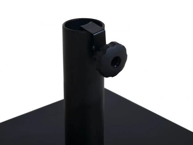 Dieser Schirmfuß überzeugt durch seine flache Bauweise. Gerade auf kleineren Terrassen kann so eine „Stolperfalle“ vermieden und ein Schirm dennoch ordentlich befestigt werden. Das für einen Schirmständer eher geringe Gewicht wird durch sein großes Grundmaß ausgeglichen. An den ecken angebrachte Gummischoner bieten diesem Sockel einen soliden, rutscharmen Stand. Dank einer Verstellschraube mit innenliegender Führungsschiene können Sonnenschirme mit verschiedenen Stockdurchmessern fixiert werden..